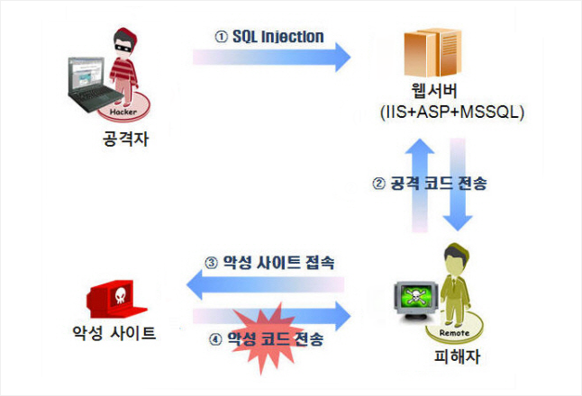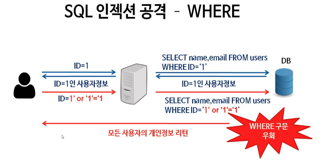 악의적인 공격자, 해커가 임의의 SQL 구문을 주입합니다.